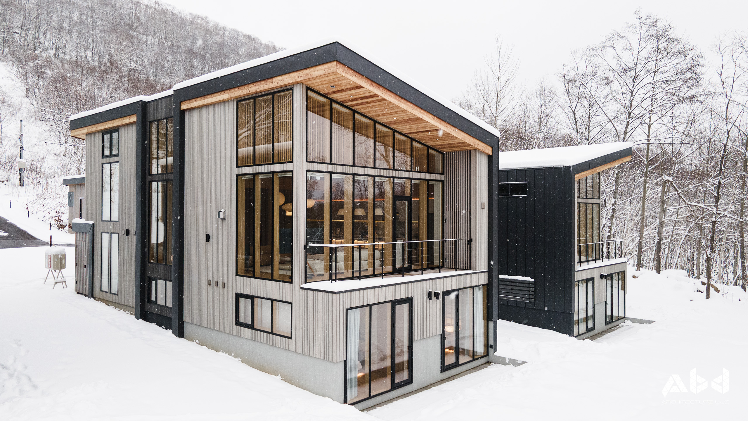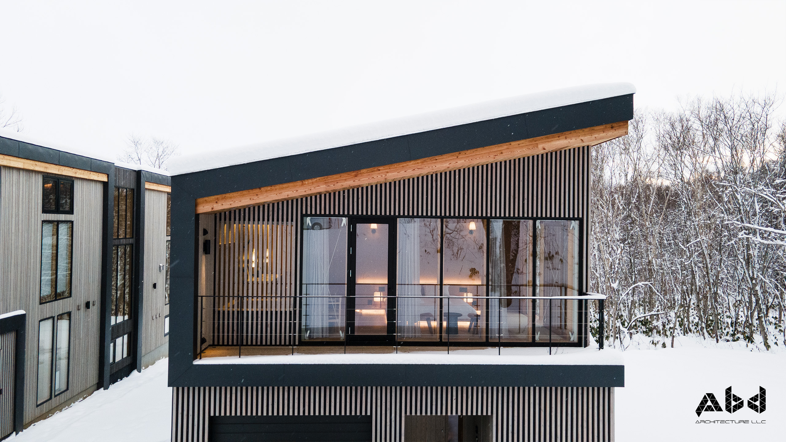 Inspired by Japanese culture and the beauty of nature, Grand Tsuru Niseko stands as an architectural masterpiece. The name, meaning “crane” in Japanese, symbolizes the spirit of the project—echoed in the mirrored slopes of the roofs. Each villa conveys a sense of weightlessness reminiscent of traditional Japanese timber framing, enhanced by extended eaves, vertical metal cladding, and natural wood louvers that bring warmth and texture to the façade.